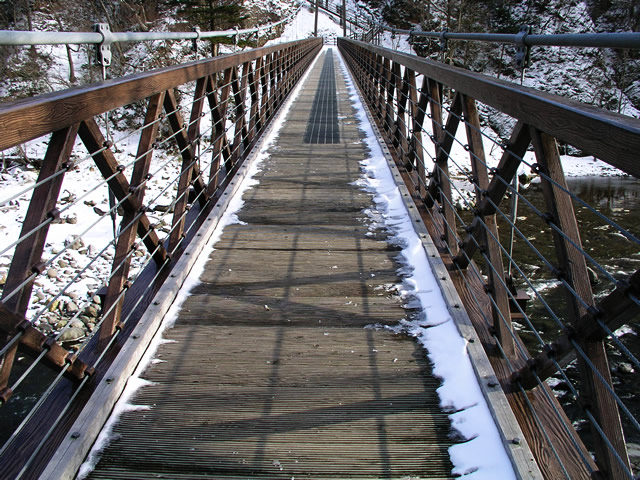 冬の河にかかる吊り橋。雪が積もっているので、滑りそうです。