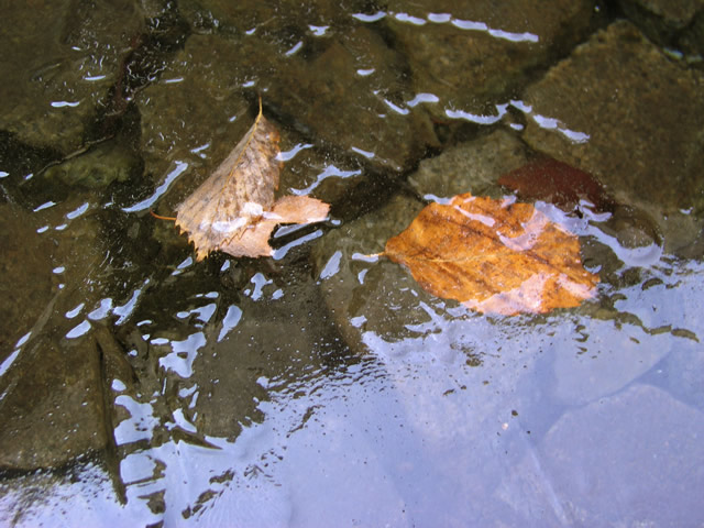 早朝の散歩に出たら、池のフチに薄く氷がはっていました。氷に閉じ込められた落葉がガラス細工のようです。