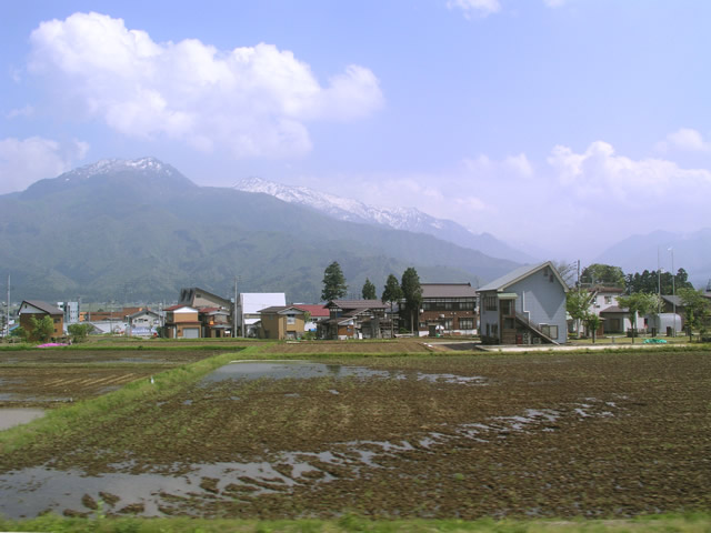 富山県。雪山を背景に広がる懐かしの田園風景。
