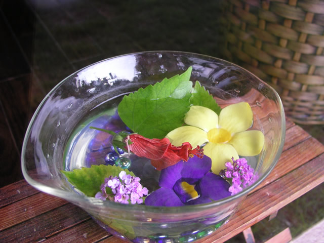 ハイビスカス、 ランタナなど南国らしい花を、ビー玉を敷いたガラス器に浮かべて。 涼しげで素敵でした。