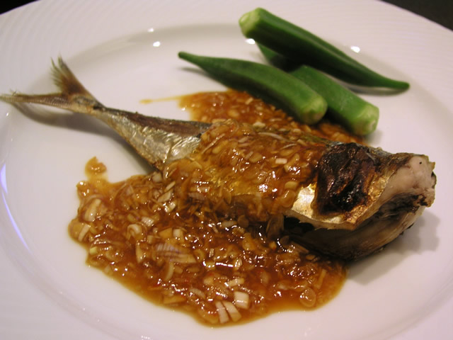 塩焼きしたあじに、山椒と紹興酒で香り付けした甘辛ソースをかけてみました。 たっぷりのみじんぎりネギもポイントです。 付け合わせは、オクラの塩ゆで。